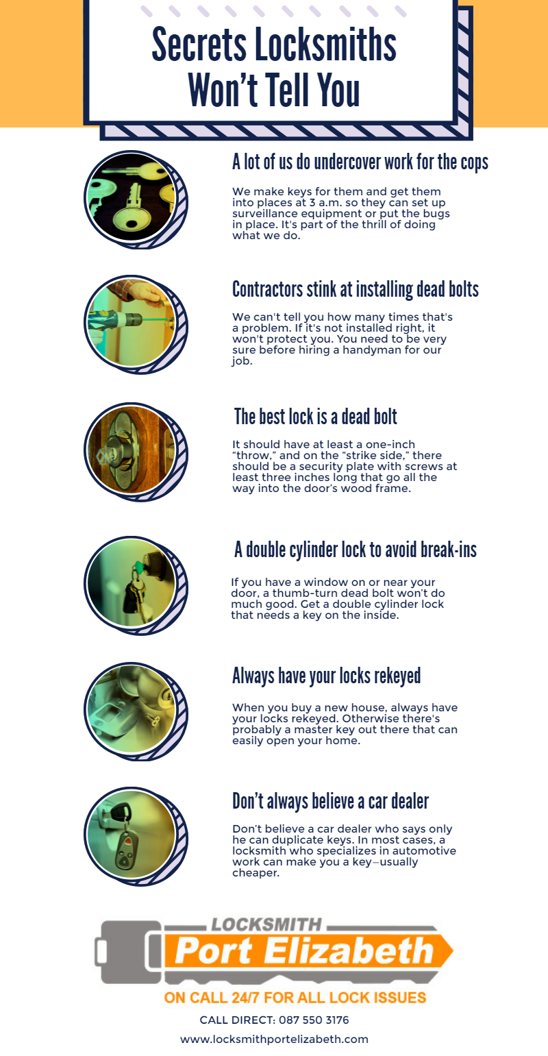 Get all the locksmith services you require from the best locksmiths in Port Elizabeth. With years of providing locksmith services in this region, our reputation and growing customer base speak volumes. Whether you require residential, commercial or car locksmith services, we are the right team to call. All our workers meet the set standards for locksmiths, which ensure that our customers get to work with the best. To get reliable and fast services in Port Elizabeth, call us on 087 550 3176 or visit our website at https://www.locksmithportelizabeth.com for more information.
